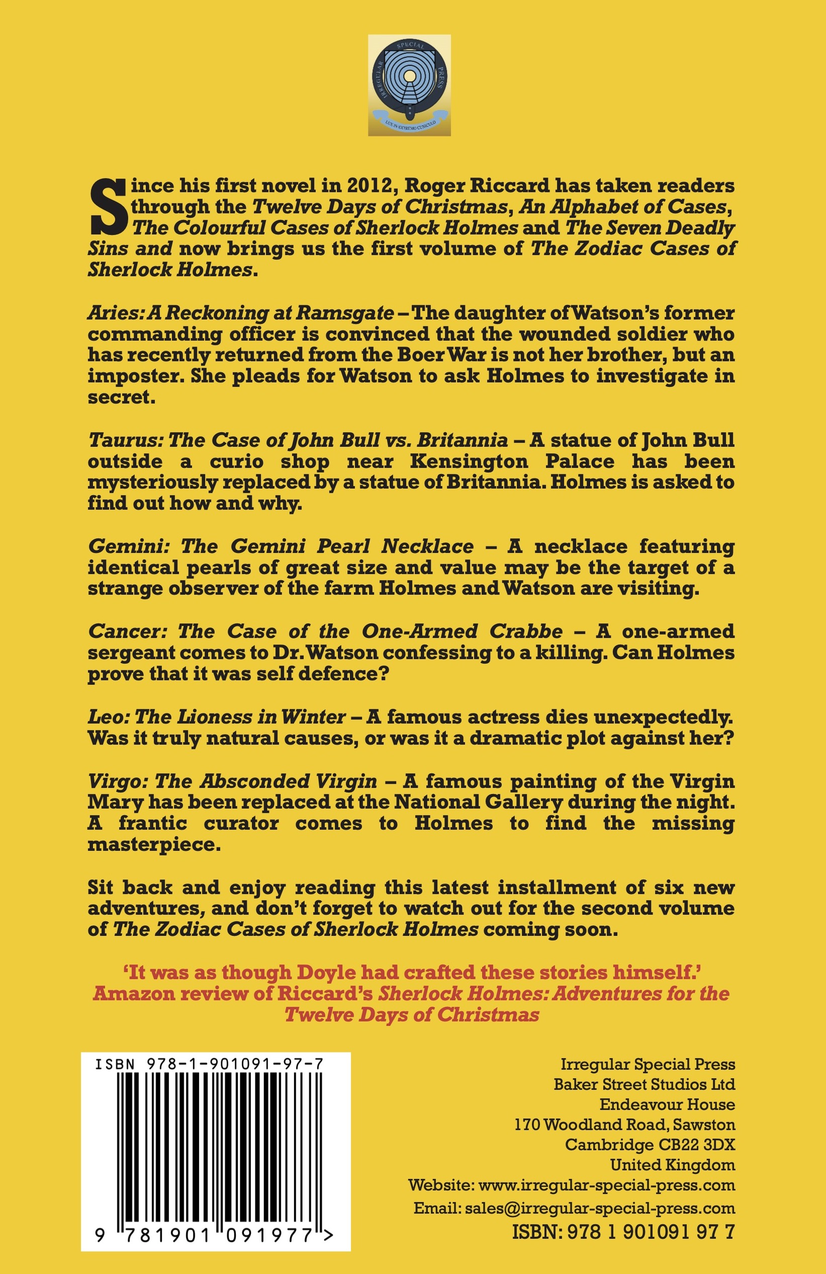 Since his first novel in 2012, Roger Riccard has taken readers through the Twelve Days of Christmas, An Alphabet of Cases, The Colourful Cases of Sherlock Holmes and The Seven Deadly Sins and now brings us the first volume of The Zodiac Cases of Sherlock Holmes.